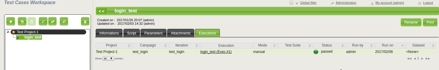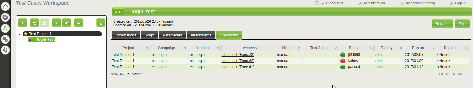 2. Click the test case you ran and click the Executions tab . From this tab, you can track the execution time and status of your test case.