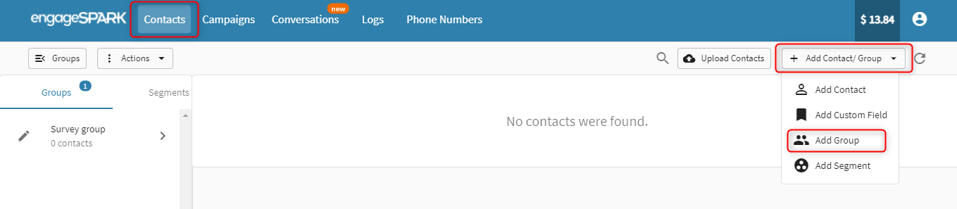 Step 1: Go to the “Contacts” page. Press the option “Add Group” from the “Add Contact/Group” drop-down menu