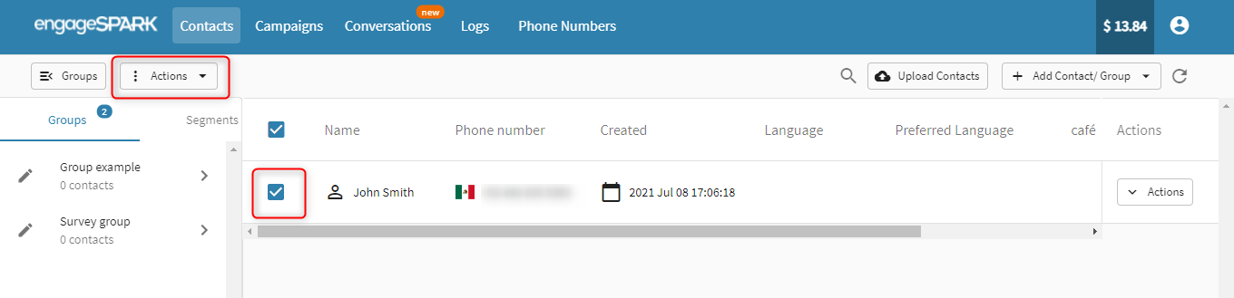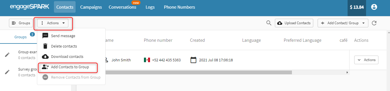Step 3: To add a contact, select the contact you want to add to your newly created group. Click the “Actions” drop-down menu on the top left: