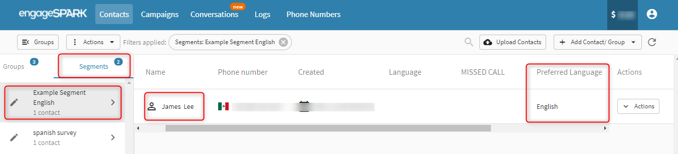 Go to the Segments section and click on the new Segment. You will see one of the two uploaded contacts because only one of them had English as their language: