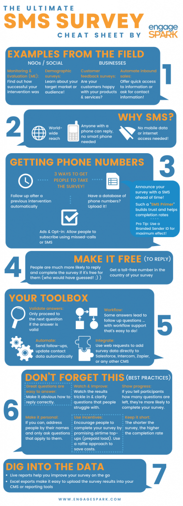 SMS Surveys are a great way to get feedback from customers, gather data from citizens, or run M&E follow-ups in collaboration with beneficiaries. Because text messaging surveys are such an important tool to businesses and NGO’s alike we’ve put together a lot of goodies in the following SMS Survey infograpic: answers to questions we’ve been asked many times, lessons we’ve learnt (sometimes the hard way), small best practices that can go a long way to make your text survey a success.