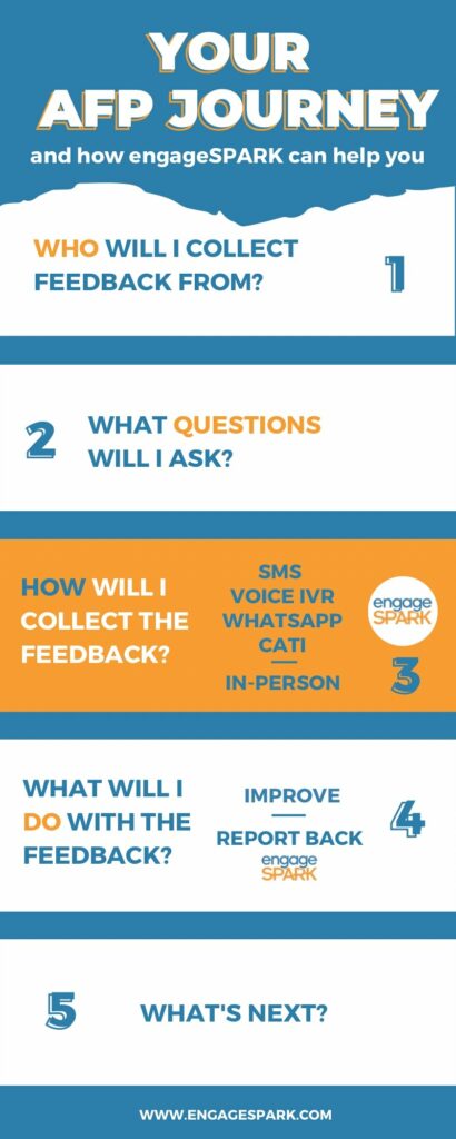 For example, at engageSPARK we have seen surveys fail because participants are overwhelmed by way too many questions. Another frequent source of problems is the phrasing: it’s not clear how to answer the question correctly. How can you do better? Read here about best practices for SMS Surveys. There are many tips on our blog. - How will I collect the feedback? You can either approach constituents for this purpose, or make feedback gathering part of an existing habit, for example a meeting that’s happening anyway. Keep in mind that AFPs are encouraging the inclusion of people from marginalized groups … as the name says, these people are marginalized, and may suffer repercussions for speaking out. Your feedback mechanisms should aim to be confidential, private and secure, and generally minimize the use of personally identifiable information (PII).