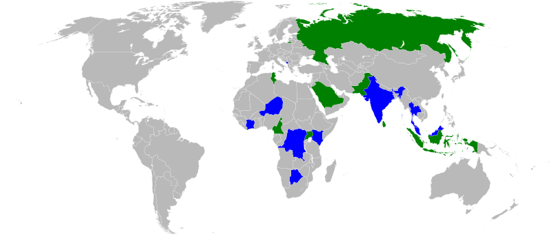 Wikipedia Zero is available for all languages (blue) and for some languages (green). Image by Wikimedia.