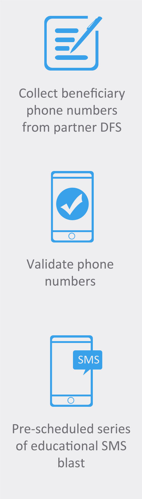 They sent out weekly SMS blasts to women enrolled in the program totaling to 280,977 SMS sent throughout the course of 6 months that ended in December 2018 with an estimated SMS cost of $4,400.