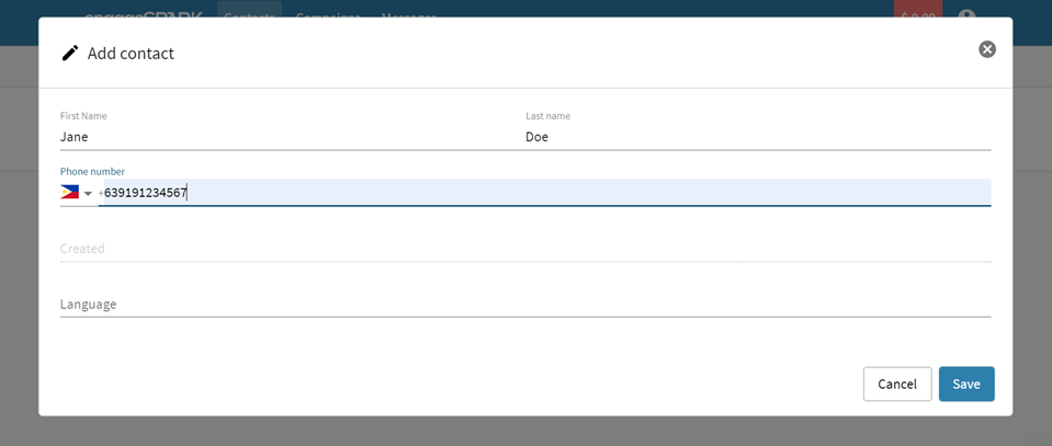 2. Next, fill in the needed contact details like First and Last Name in the pop-up window that will appear (optional). When typing the phone number, make sure to include the country code. If you don’t know the country code, you can refer here.