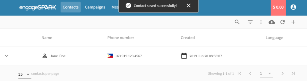 Once the contact is successfully added to your account, you can send your first SMS and have a firsthand experience of sending a personalized message! Here’s how: Send SMS via Contacts Page.