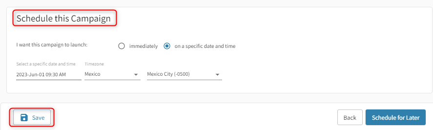 At the very bottom, you will see a section called “schedule this campaign.” Select the launch date you wish to set for your campaign, and now simply press the Save button.