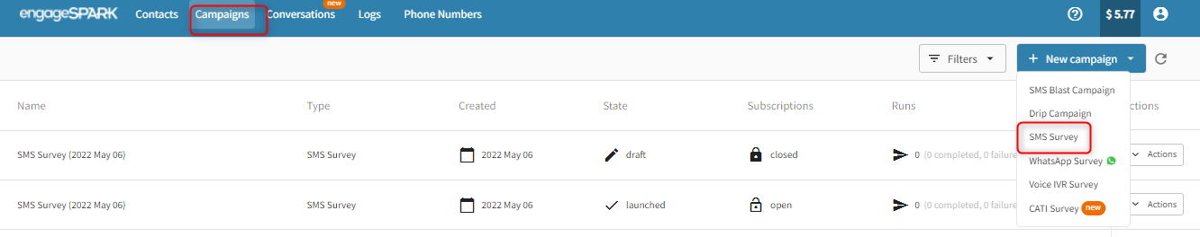 First, go into your campaigns tab and select the type of campaign you wish to create. For this example, we will create an SMS campaign.