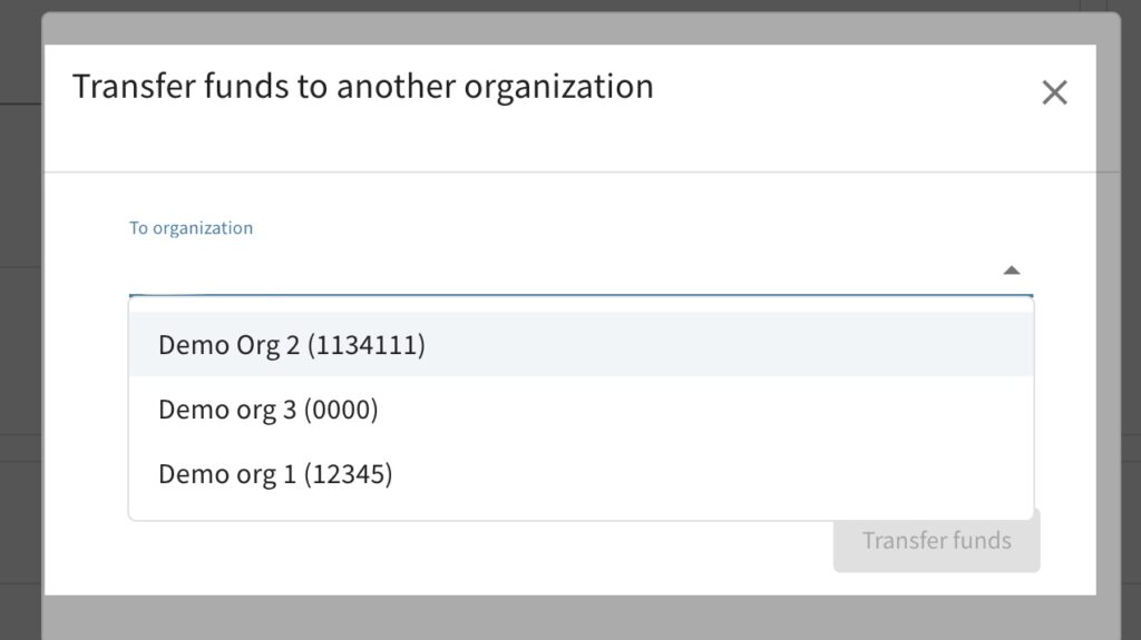 - Click the dropdown in “To organization” and select the organization you want to transfer funds to. You can only transfer funds to an organization you are part of.