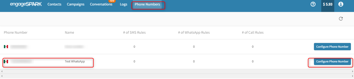 - Go to the Phone Numbers tab at the top of your screen. There you will find your WhatsApp enabled number. Click on the Configure Phone Numbers button on the right.