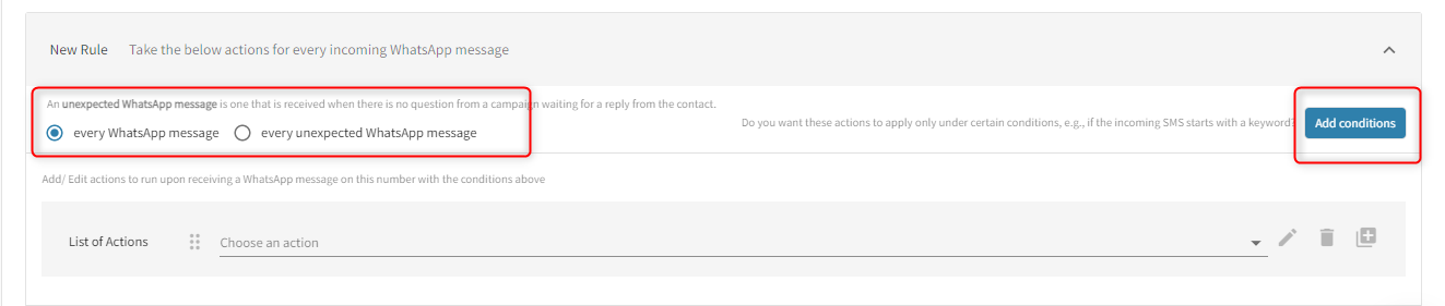 3. A New Rule section will show up where you can start setting your rules. Select the appropriate radio button of whether you want us to take action on every WhatsApp message that the virtual number receives or only on every unexpected WhatsApp message.