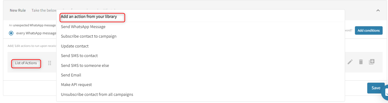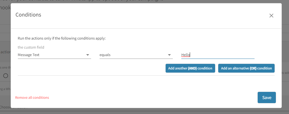 For example, in this condition, you are letting the system know that you want every incoming message that equals the word “Hello” to run a set of actions like sending back an automated WhatsApp response or subscribing them to one of your other campaigns – you can do so. You can add as many and/or conditions as you want and trigger as many actions.