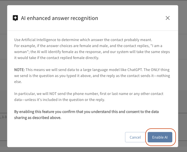 - We’ll forward data to a large language model like ChatGPT. Only the question and the contact’s reply will be sent, excluding any personal information like phone numbers or names, unless it is included within the question or reply.