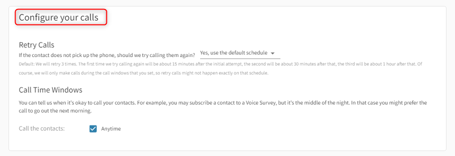 Here you can configure the Retry Calls function and the Call Time Window (which is what we’re after).