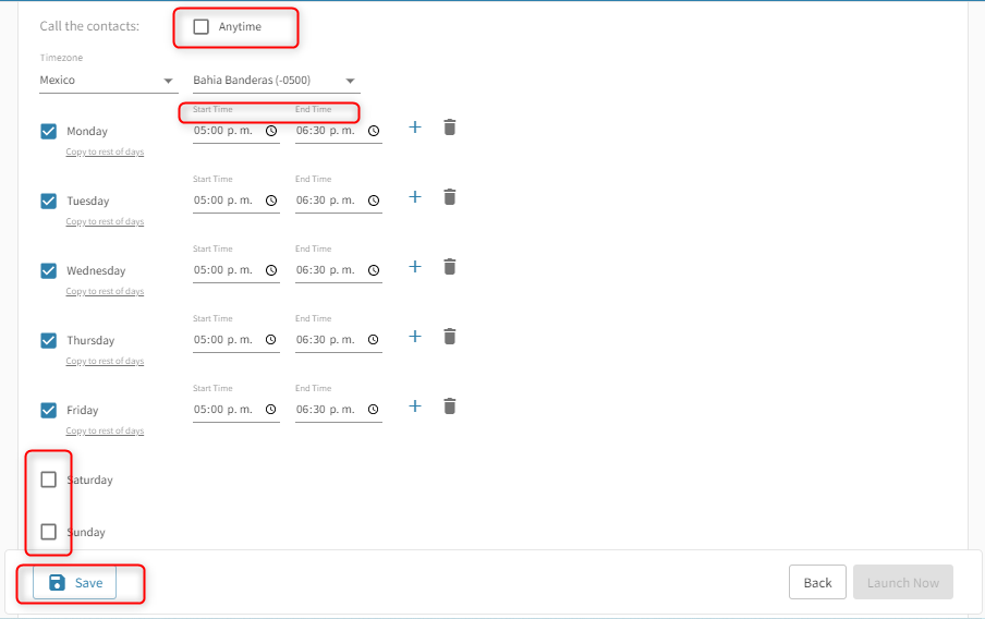 Simply uncheck the box that says Anytime and you will be able to select the days and times during which you want your calls to go out. For this example, I will configure my calls to go out every day from 5 pm- 6.30 PM, but not at all on Saturday and Sunday.