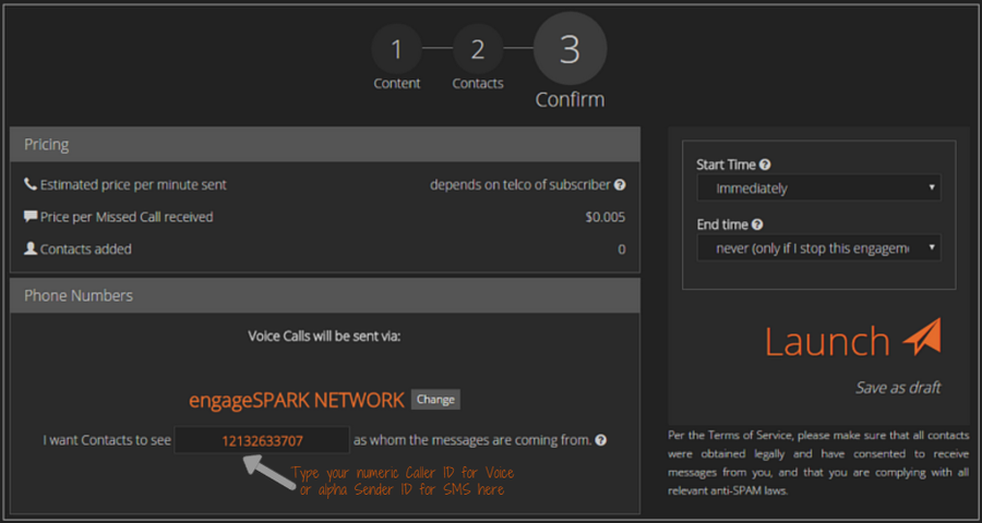 Step 3 lets you review the expected cost of sending messages and the number of contacts added; set the ‘send route’ or the phone number that will send the messages; and schedule when the engagement goes live.
