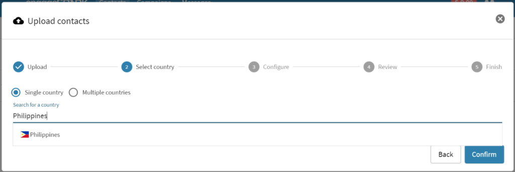 3. Upon uploading, you will be directed to the window below and will be prompted to select whether your contact list is from a single country or multiple countries.