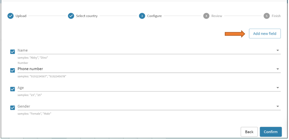 4. In the Configure step of uploading contacts, it will show you the column headers our platform captured from your excel file that matches the existing columns on the contacts page. Make sure that the reflected column headers are the same as the existing columns on the contacts page. You can also add new columns (that are in your excel file but not yet on the contacts page) by clicking the Add new field. Then, on each column dropdown, select the newly created column header that matches the column header name on your excel file. When done, just click Confirm to continue.
