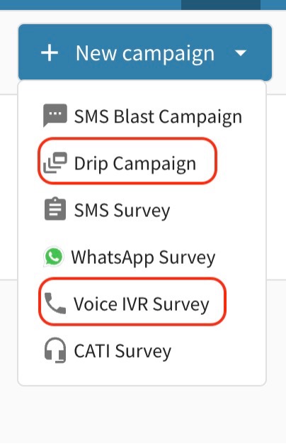 - Click the new campaign button and select Voice IVR Survey or Drip Campaign