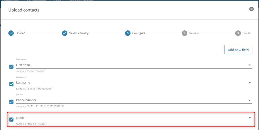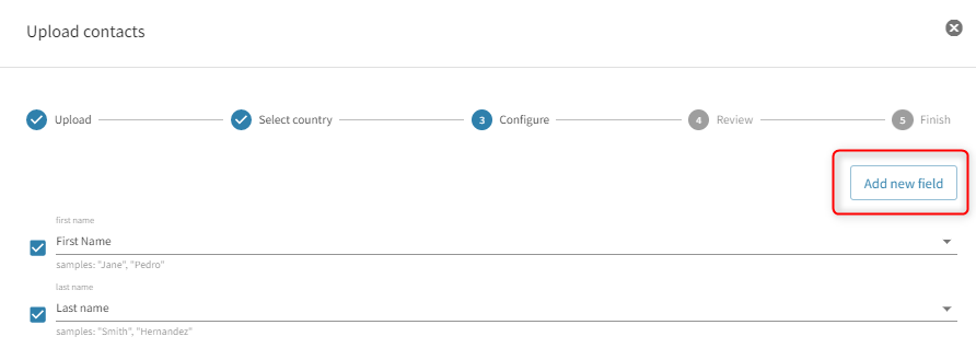 5.Follow the rest of the contact upload steps. If the custom fields in the file you are trying to upload do not exist yet on your Contacts page, step 3 of the upload process will show that the Column name from your file has no matching field on the platform.