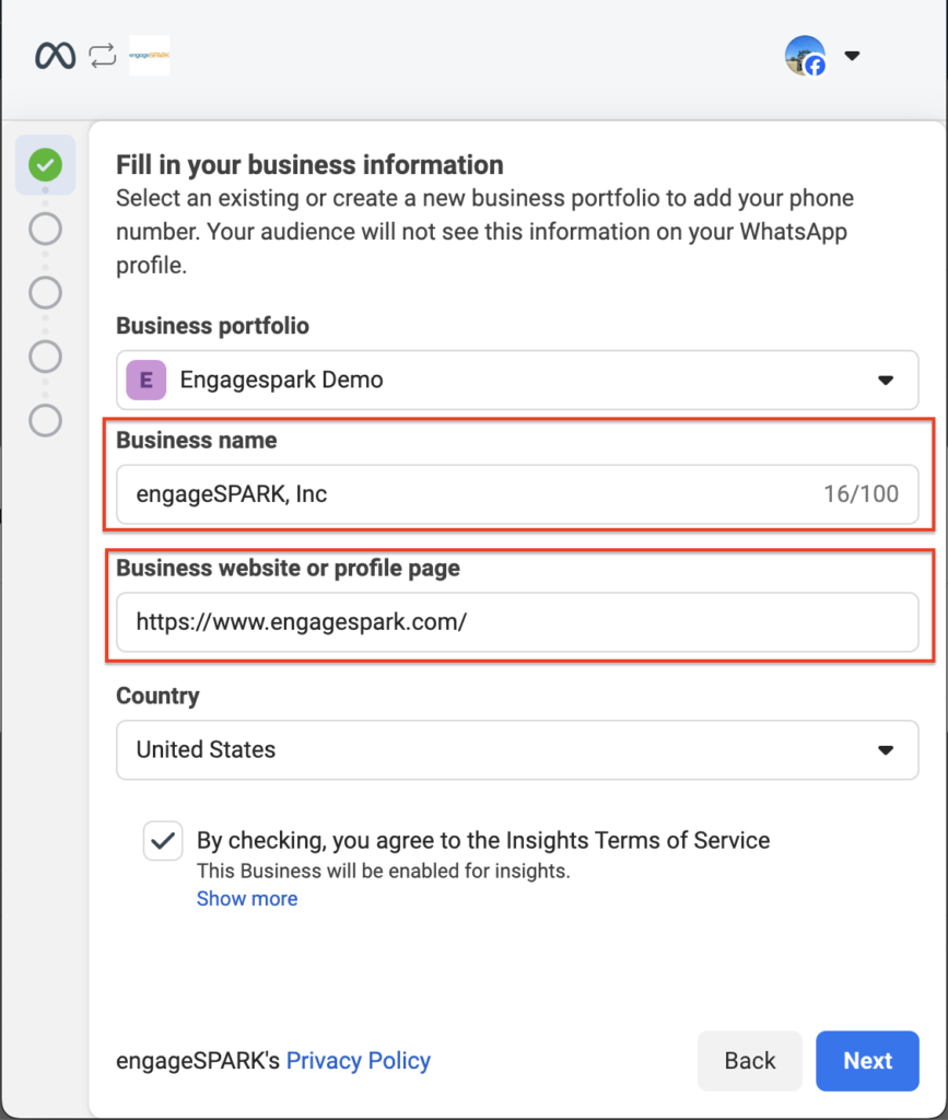 1. The Business Portfolio admin will need to provide your business name and website. Then tick the box to agree to the Insights ToS.